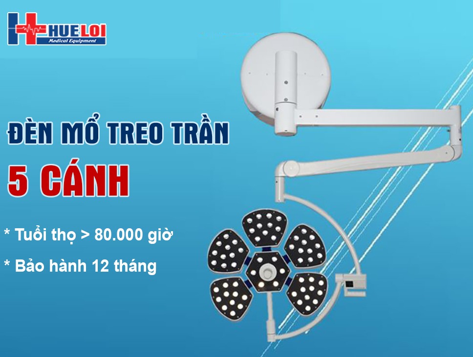 Đèn Phẫu Thuật treo trần 5 cánh LED5 với bóng đèn LED ORSAM nhập khẩu từ Đức, tuổi thọ lên tới 80.000 giờ chiếu sáng, độ rọi sáng 180.000 lux, lắp đặt và sử dụng dễ dàng